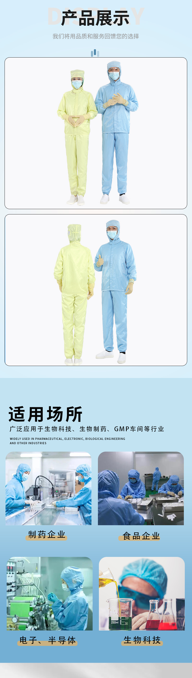 產品性能優勢:潔凈防塵、阻隔粉塵顆粒物、耐高壓濕熱滅菌、永久防靜電、立體剪裁、不起球、布面光潔