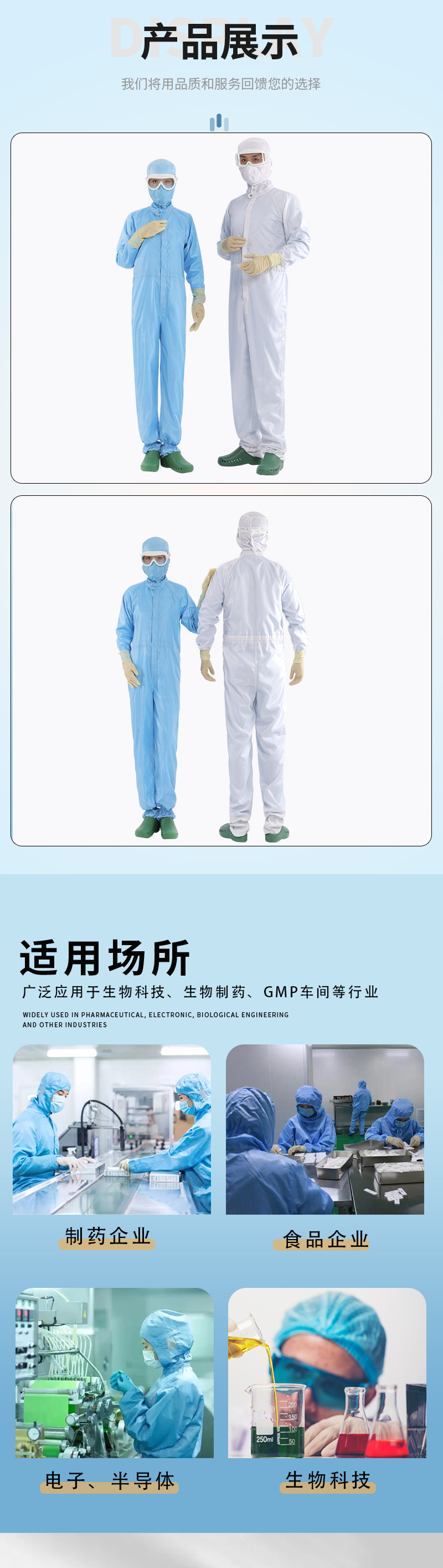 產品性能優勢:潔凈防塵、阻隔粉塵顆粒物、耐高壓濕熱滅菌、永久防靜電、立體剪裁、不起球、布面光潔
